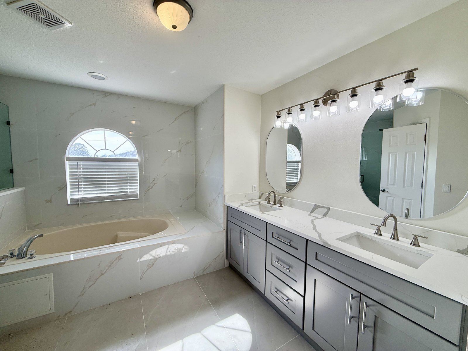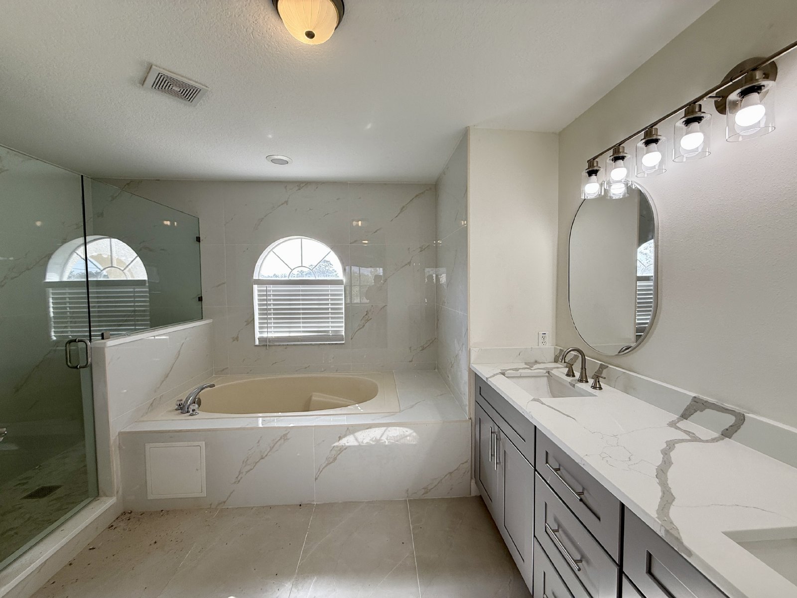 Upstairs, the vinyl plank flooring continues into all the spaces. The lovely Primary Bedroom has two closets, one is a walk-in. The connected ensuite Primary Bathroom has a two-sink vanity, soaking tub, and a large walk-in shower with upgraded fixtures. All the cabinets, lighting and tile in the baths are BRAND NEW. There are three more bedrooms and one full bath upstairs, along with an open loft area. There are ceiling fans throughout the home and all fixtures and lighting are BRAND NEW. There is also BRAND NEW interior paint throughout.