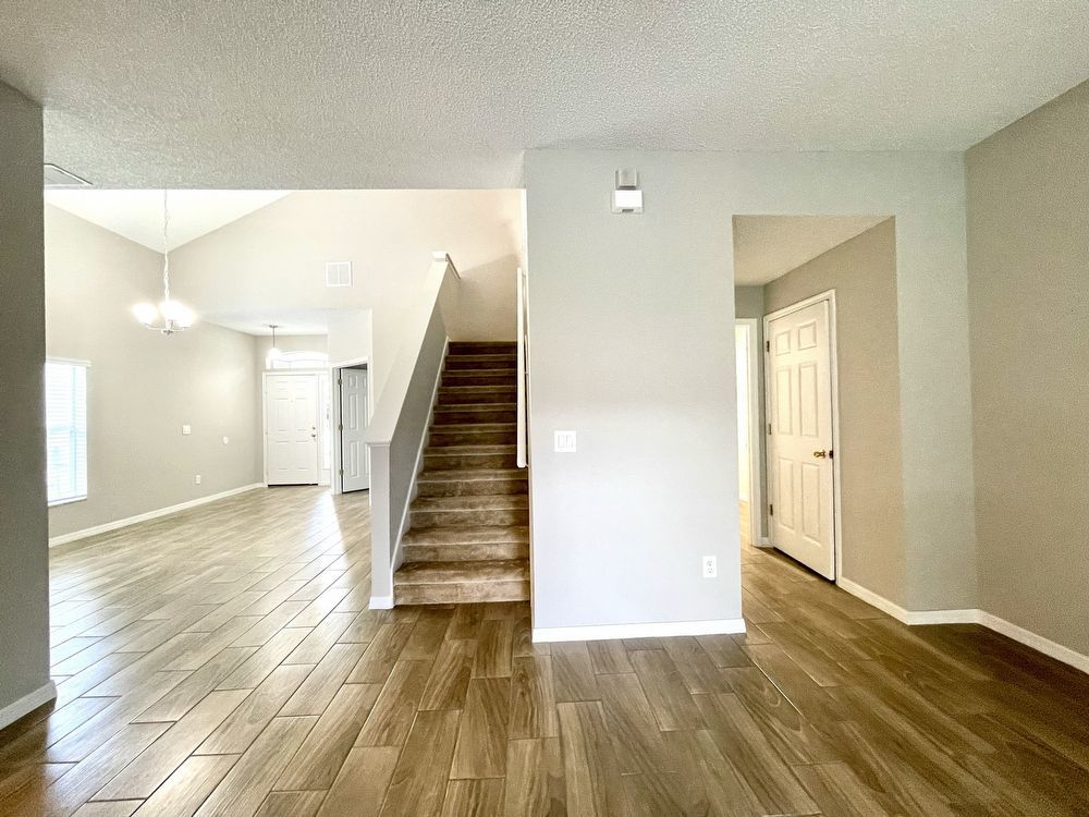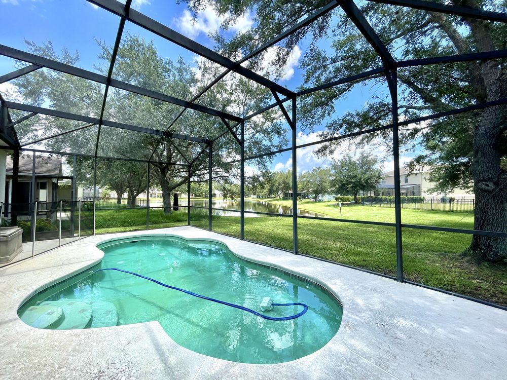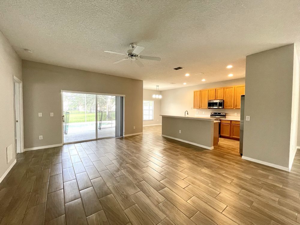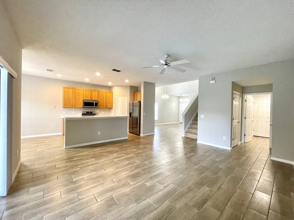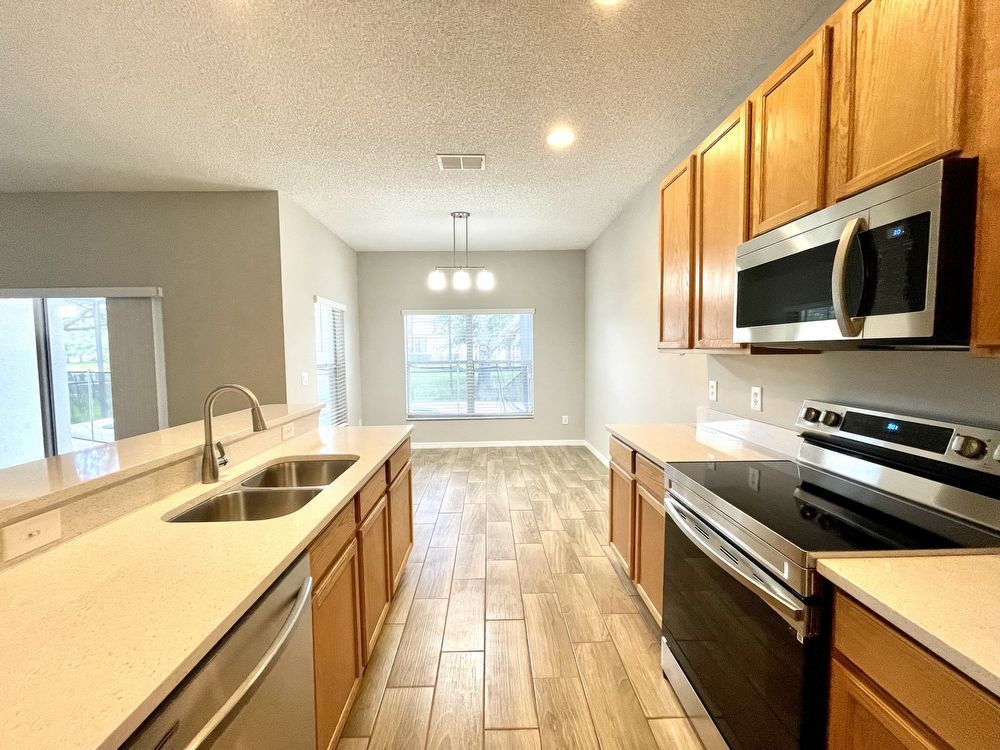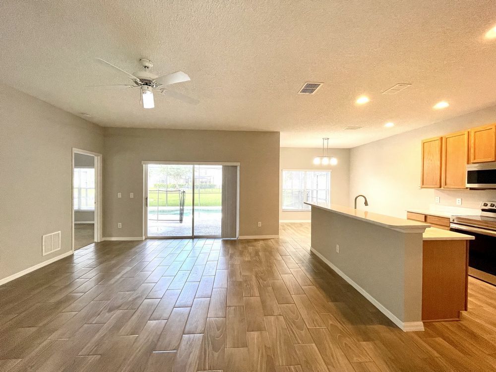 This beautiful, Two-Story, 4 Bedroom, 2.5 Bath Orlando Rental Home is located in the gated Rybolt’s Reserve Subdivision. On a premium lot with a pond view, this home is a stunner! This beauty has wood look tile flooring beginning in the entry and extending all through the main areas on the first floor. The open floor plan has the formal Living Room on the front of the home connecting to the Great Room, Kitchen, and Dining Area. With views to the screened pool and rear pond, the Kitchen has an island/bar top, quartz countertops and stainless-steel finish appliances.