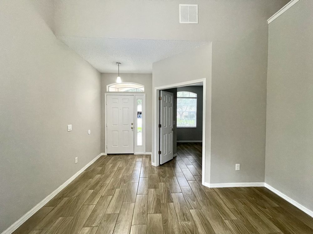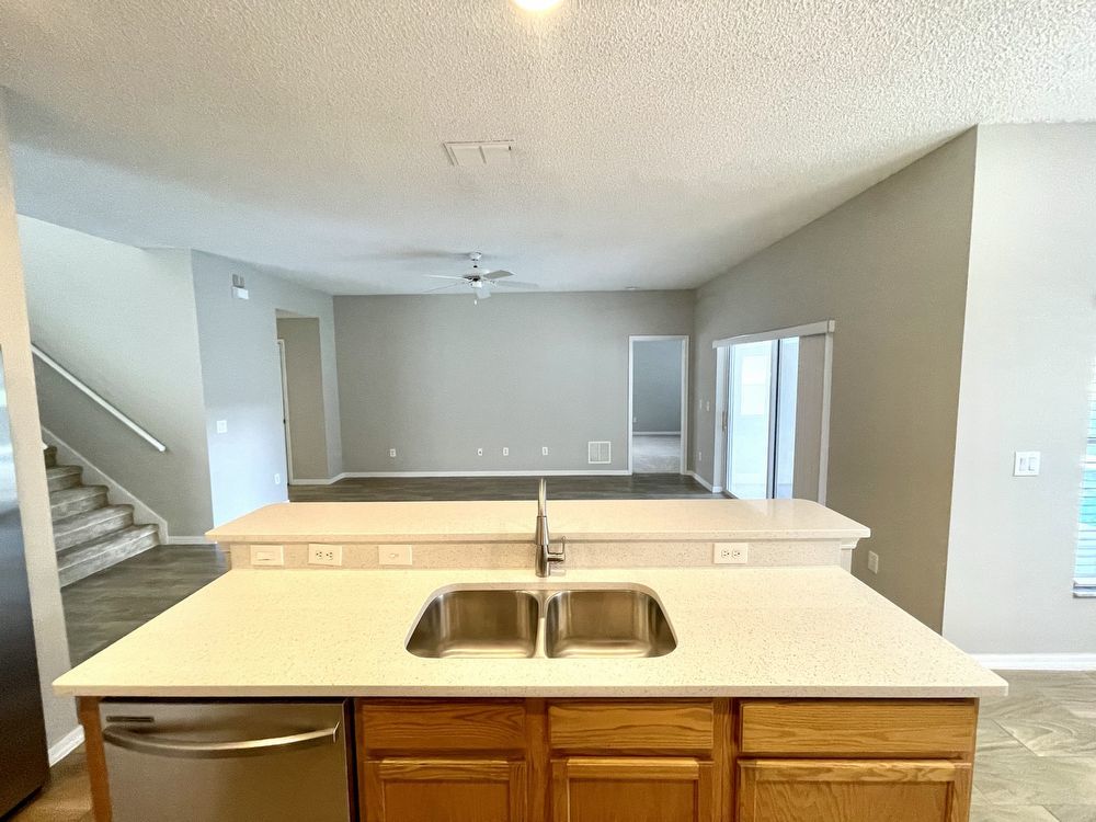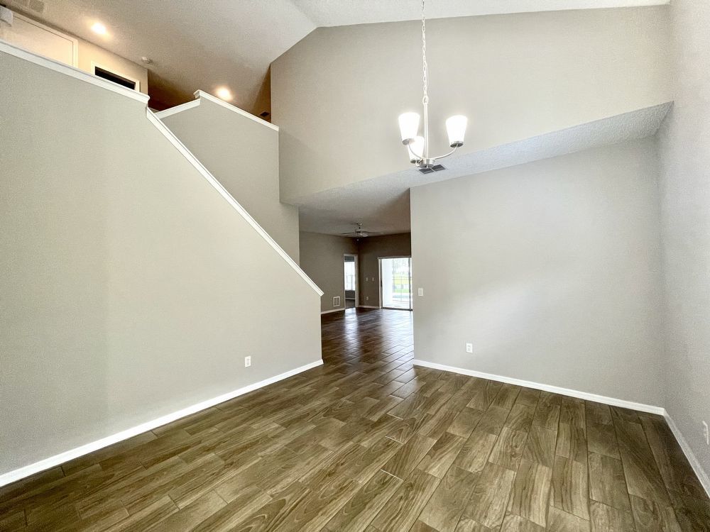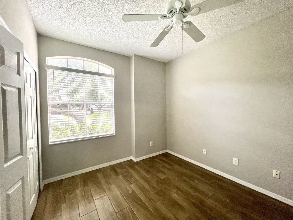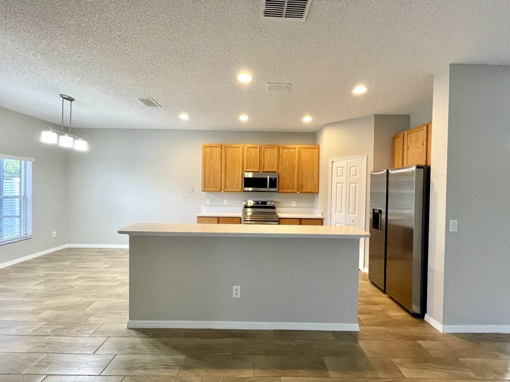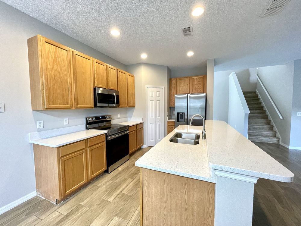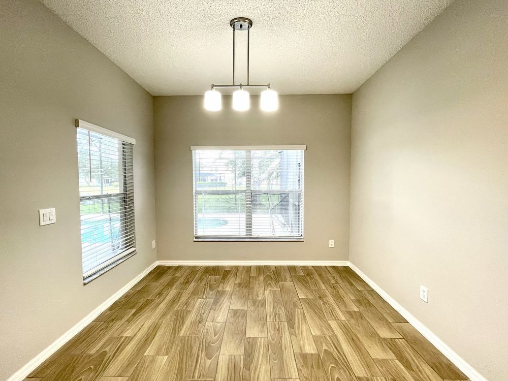 This beautiful, Two-Story, 4 Bedroom, 2.5 Bath Orlando Rental Home is located in the gated Rybolt’s Reserve Subdivision. On a premium lot with a pond view, this home is a stunner! This beauty has wood look tile flooring beginning in the entry and extending all through the main areas on the first floor. The open floor plan has the formal Living Room on the front of the home connecting to the Great Room, Kitchen, and Dining Area. With views to the screened pool and rear pond, the Kitchen has an island/bar top, quartz countertops and stainless-steel finish appliances.