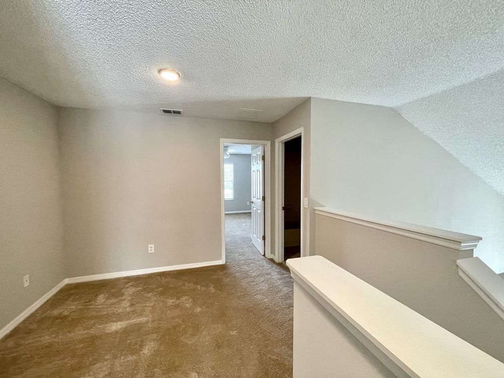 Walking up the stairs with carpet flooring you will find a loft area at the top of the stairs which could be utilized as a smaller sitting area or desk/workspace. Bedrooms 2 and 3 are upstairs and both have carpet flooring and ceiling fans. The full Hall Bathroom has tile flooring and shower/tub combo.