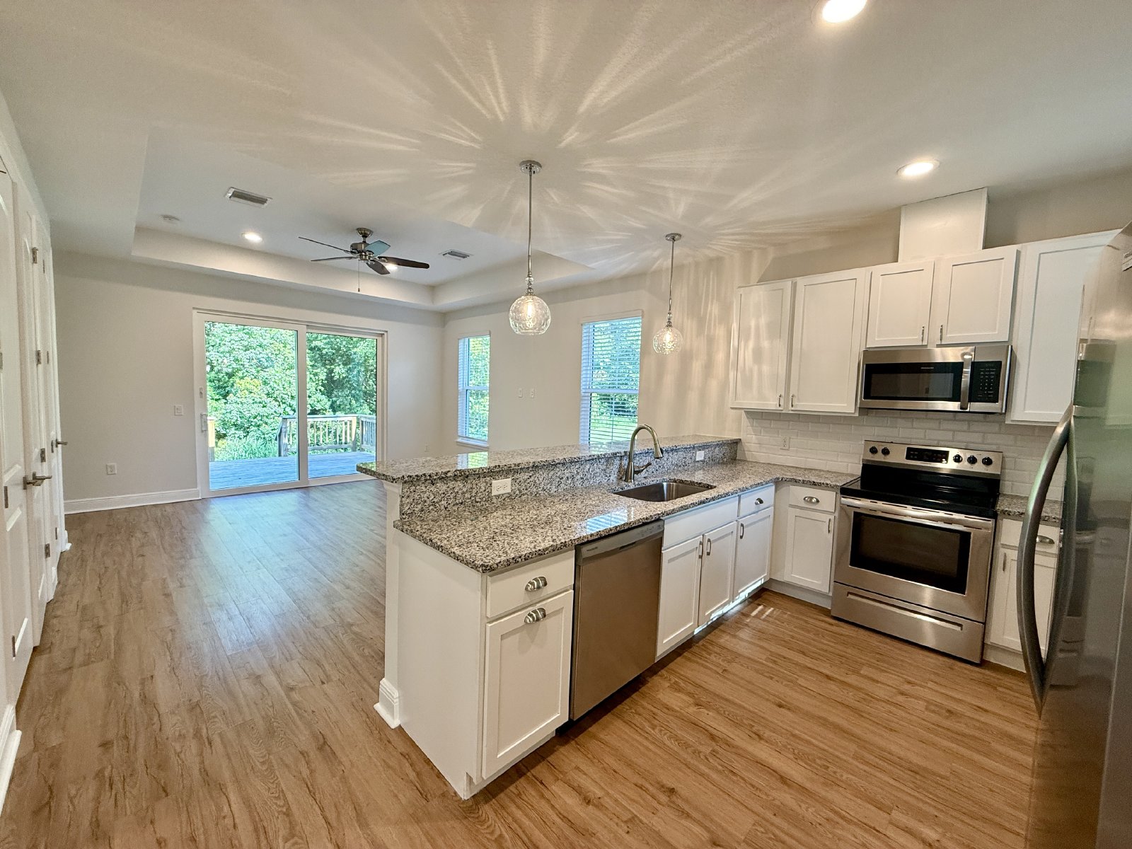 Welcome to 963 Beau Court, a beautifully modern duplex located in the heart of Orange City, Florida. This inviting home offers 2 spacious Bedrooms and 2 modern Bathrooms, making it perfect for anyone seeking comfort and convenience. As you step inside, you'll be greeted by a bright and open living space with high ceilings and featuring sleek fixtures throughout. The flooring is a beautiful Luxury Vinyl Plank that looks like hardwood. The well-appointed Kitchen boasts exquisite countertops, stainless-steel appliances, and ample storage space for all your culinary needs. Whether you're preparing a quick meal or entertaining guests, this Kitchen is sure to impress. You will love entertaining at the large bar overlooking the Great Room and there are sliders that lead to the deck and backyard.